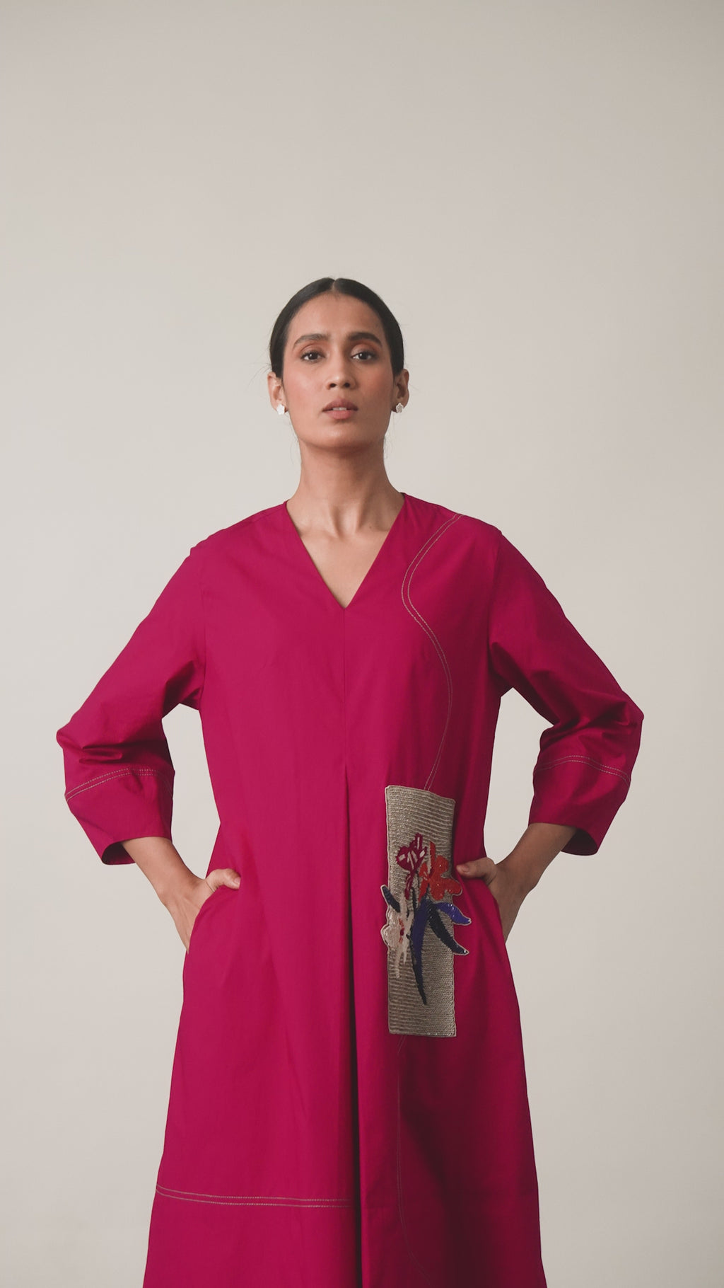A sharply tailored A line dress featuring a beautifully hand embroidered applique and contrast stitch detail.
